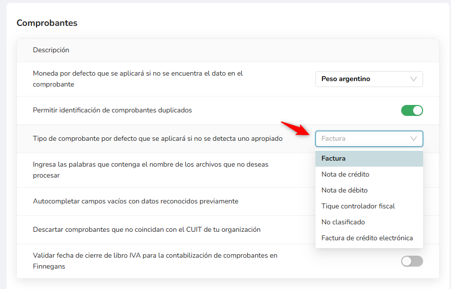 Podés configurar el sistema para que, en lugar de descartarlo, Braulio® lo clasifique automáticamente como alguno de los tipos reconocidos (Factura, Ticket, Factura Electrónica, Nota de Crédito o Nota de Débito).
