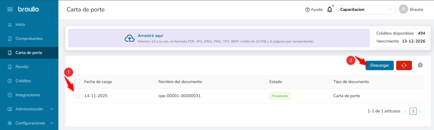 Una vez que los documentos fueron procesados y la plataforma ya identificó todos los datos relevantes, solo tenés que seleccionar las cartas de porte que querés exportar desde la bandeja de documentos. Podes elegir uno, varios o incluso todos los archivos, según lo que necesites trabajar en ese momento.